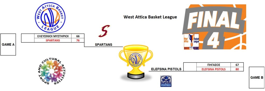 Στον Α’ Ημιτελικό αναμετρήθηκαν οι Ελευσίνιοι Μυστήριοι με την ομάδα Spartans, με τελικό σκορ 66-76.