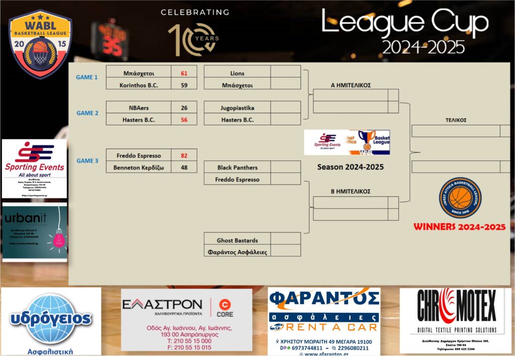 Ολοκληρώθηκαν οι δύο ημιτελικοί του Final 4 του Κυπέλλου Μπάσκετ West Attica Basketball League σεζόν 2024-2025 όπου οι ομάδες των Lions , Jugopiastika,Freddo Espresso & Φαράντος Ασφάλειες διασταύρωσαν τα «ξίφη» τους στο ΚΛΕΙΣΤΟ ΑΣΠΡΟΠΥΡΓΟΥ(Γ.Τσόκας) με φόντο το πρώτο τρόπαιο της σεζόν.