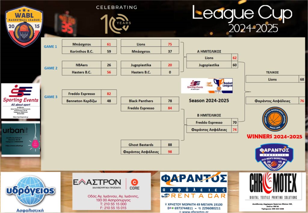 Ο Μεγάλος Τελικός του Κυπέλλου Μπάσκετ West Attica Basketball League για την σεζόν 2024-2025 ολοκληρώθηκε με μεγάλο νικητή την ομάδα Φαράντος Ασφάλειες η οποία επικράτησε ύστερα από ένα συγκλονιστικό παιχνίδι της ομάδας των Lions με σκορ 68-76.
