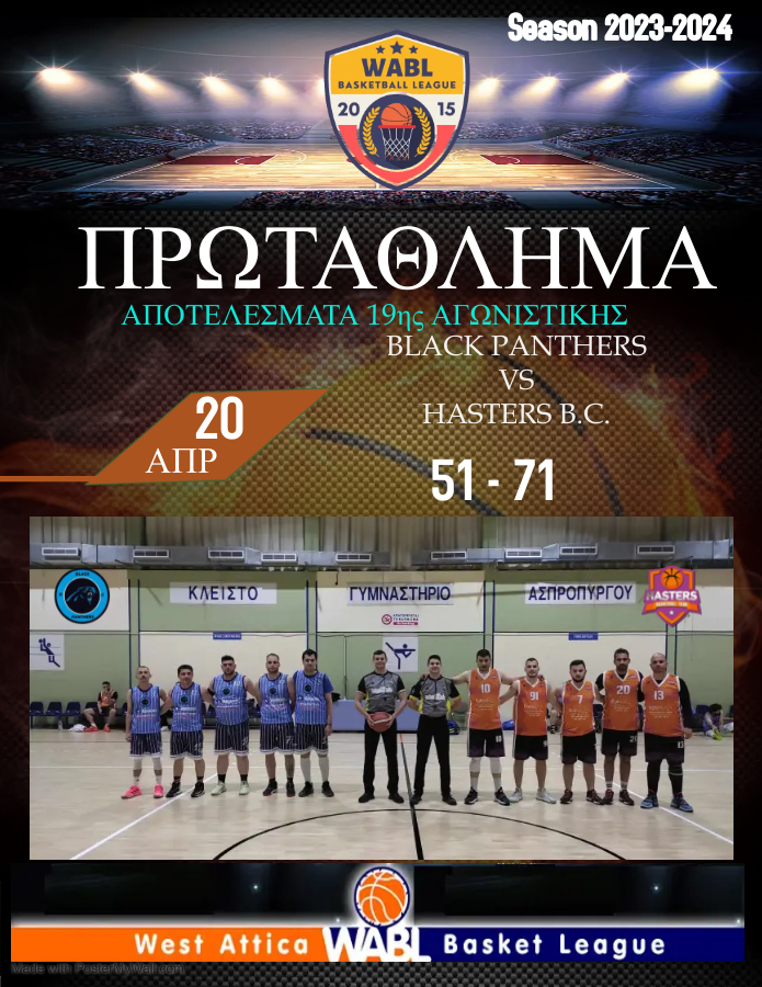 Δημοτικό Στάδιο Ασπροπύργου Τσοκας Γεώργιος Hasters B.C.- Black PanthersΑγωνιστικές: 8 Αγωνιστική