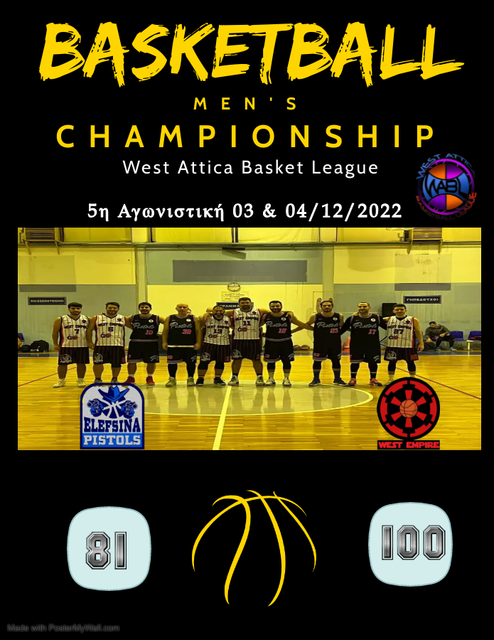 Δημοτικό Κλειστό Γυμναστήριο Μάνδρας ELEFSINA PISTOLS - WEST EMPIREΑγωνιστικές: 6η Αγωνιστική